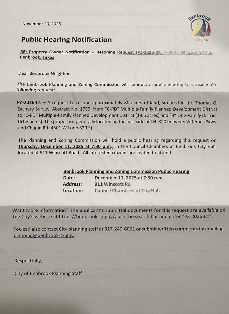 Just wanted to give you a quick heads-up on a meeting we had with with the city of Benbrook today about phase 4 of Trinity Estates. Thanks to Doug and Heath for meeting with us and answering our questions!